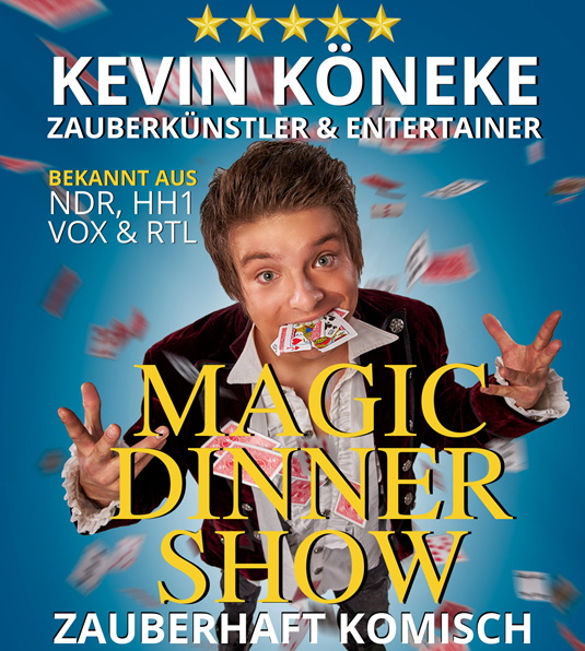 Lassen Sie sich von seiner Bühnenshow in die Welt der Zauberei und Komik entführen. Erleben Sie Momente, die Sie vielleicht noch nie gesehen oder gehört haben! KEVIN KÖNEKE ist ein preisgekrönter Zauberkünstler und Entertainer, schlagfertig, charmant und einzigartig. In seiner preisgekrönten MAGIC DINNER SHOW passieren unerklärliche Dinge, bei denen Staunen, Lachen und Träume garantiert sind.